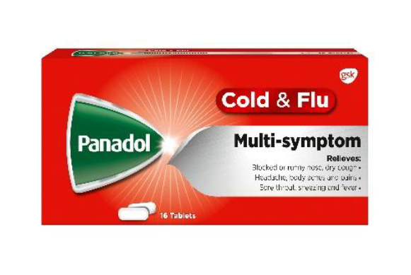 Panadol Multi-symptoms relieves: blocked or runny nose, dry cough, headache, body aches and pains, sore throat, sneezing and fever.